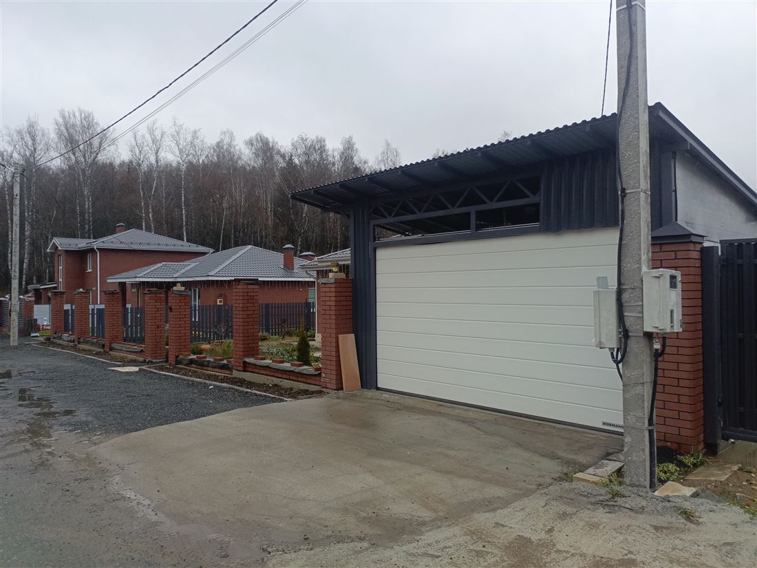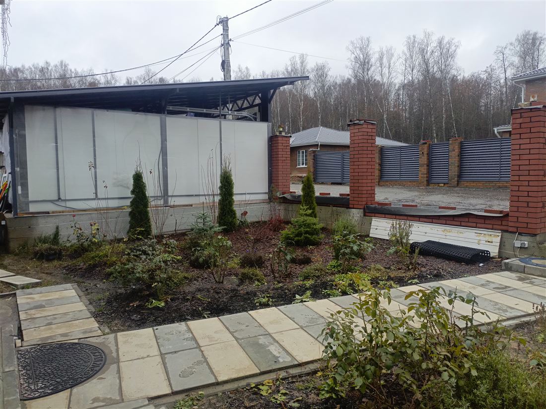 Перед домом большой металлический навес под машину с автоматическими воротами.