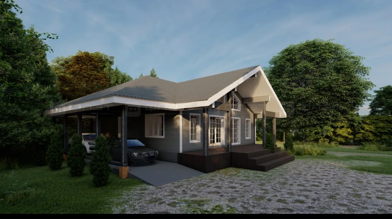 Проект предусматривает места под крышей для двух автомобилей, а так же красивую террасу и балкон.