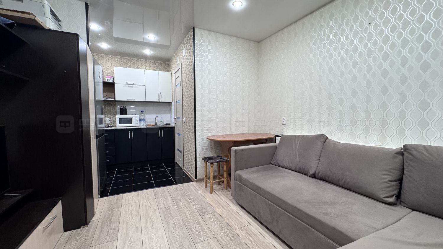 Современный ремонт, пластиковое окно, железная дверь, на полу ламинат , натяжной потолок с точечными светильниками, имеются все удобства, ванная, душевая, санузел совмещён. Всё в кафеле, горячая , холодная вода.