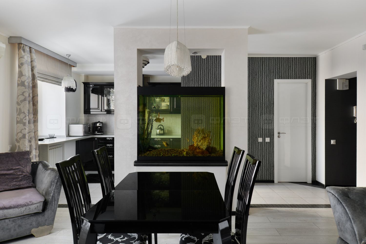 Релаксирующий во время обеда или ужина встроенный аквариум с подсветкой в гостиной.