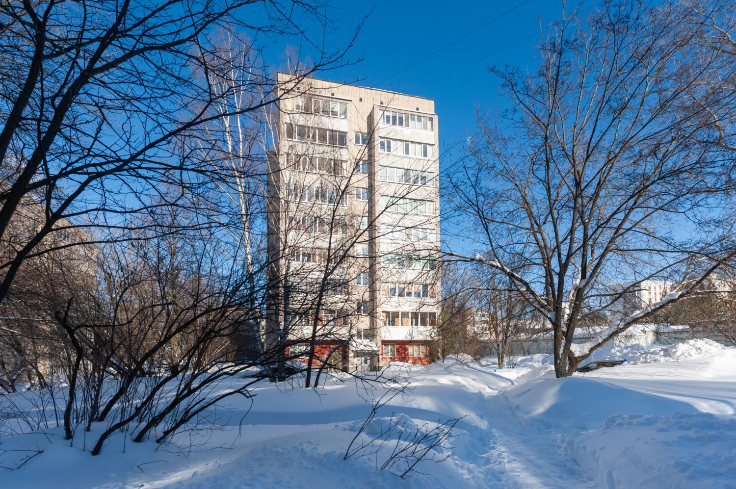 Кирпичный дом, чистый и аккуратный подъезд после ремонта.