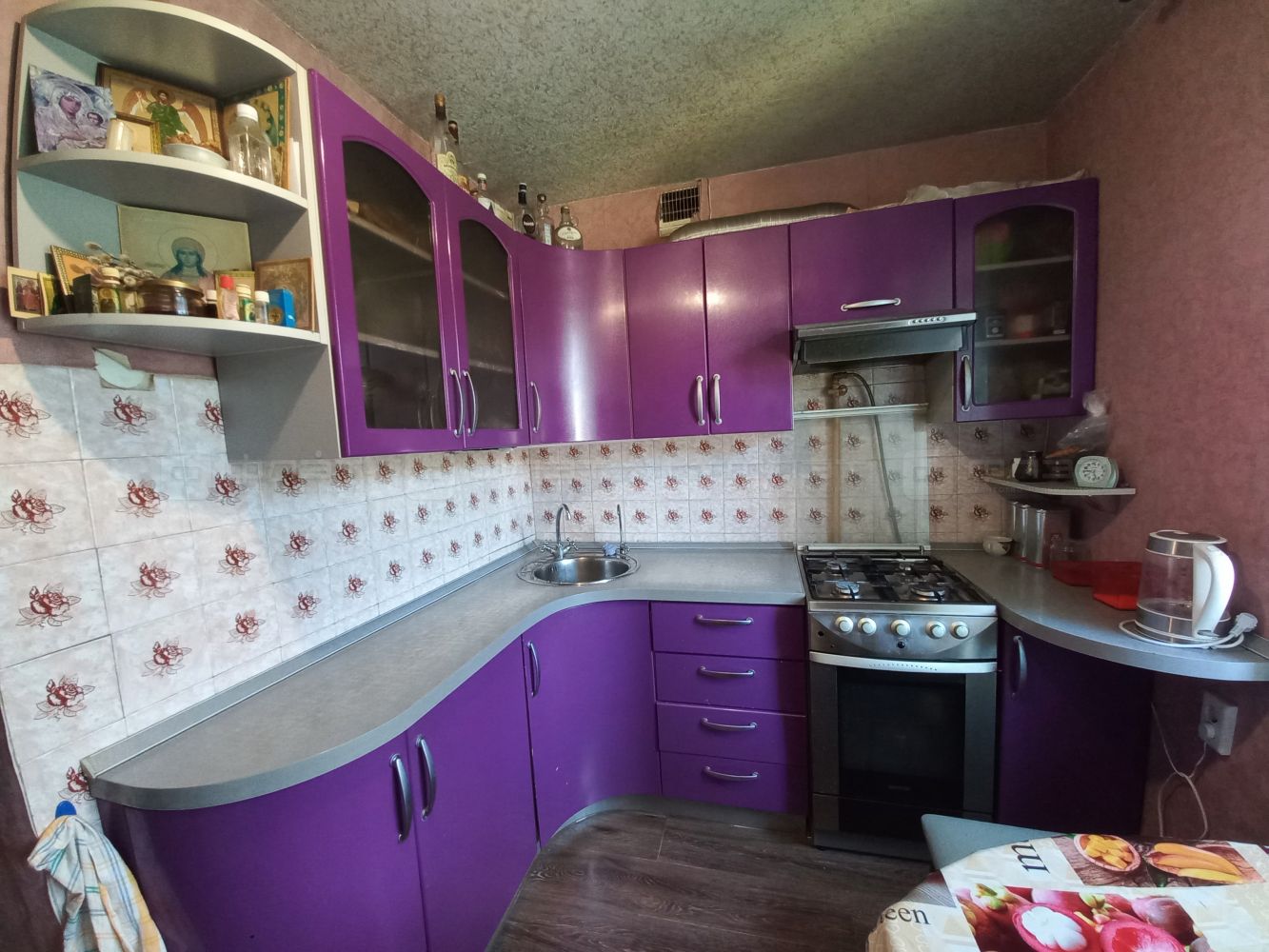 - на кухне на стенах обои, на полу качественный линолеум, остается: кухонный гарнитур с газовой плитой.