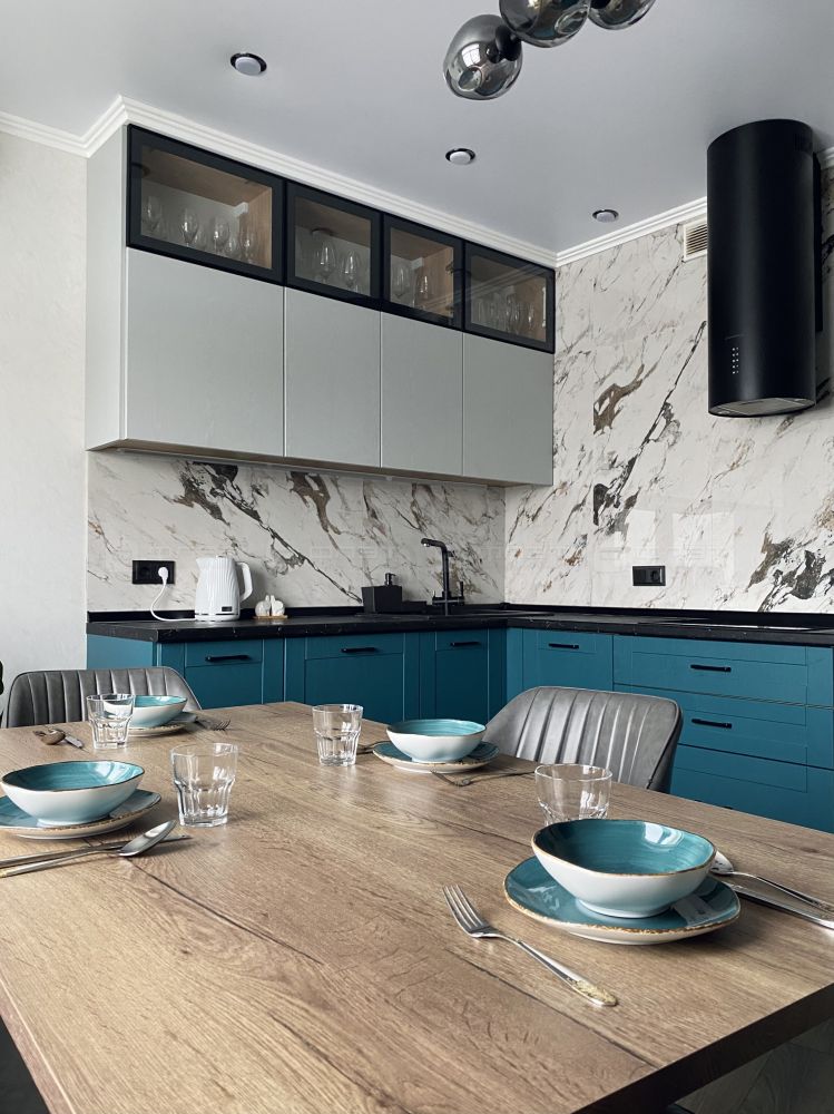 Большая, полностью оборудованная кухня. Кухонный гарнитур изготовлен на заказ, с учетов всех потребностей и оснащён встроенной техникой Electrolux (холодильник, варочная поверхность, духовой шкаф, посудомоечная машина, микроволновка, вытяжка).